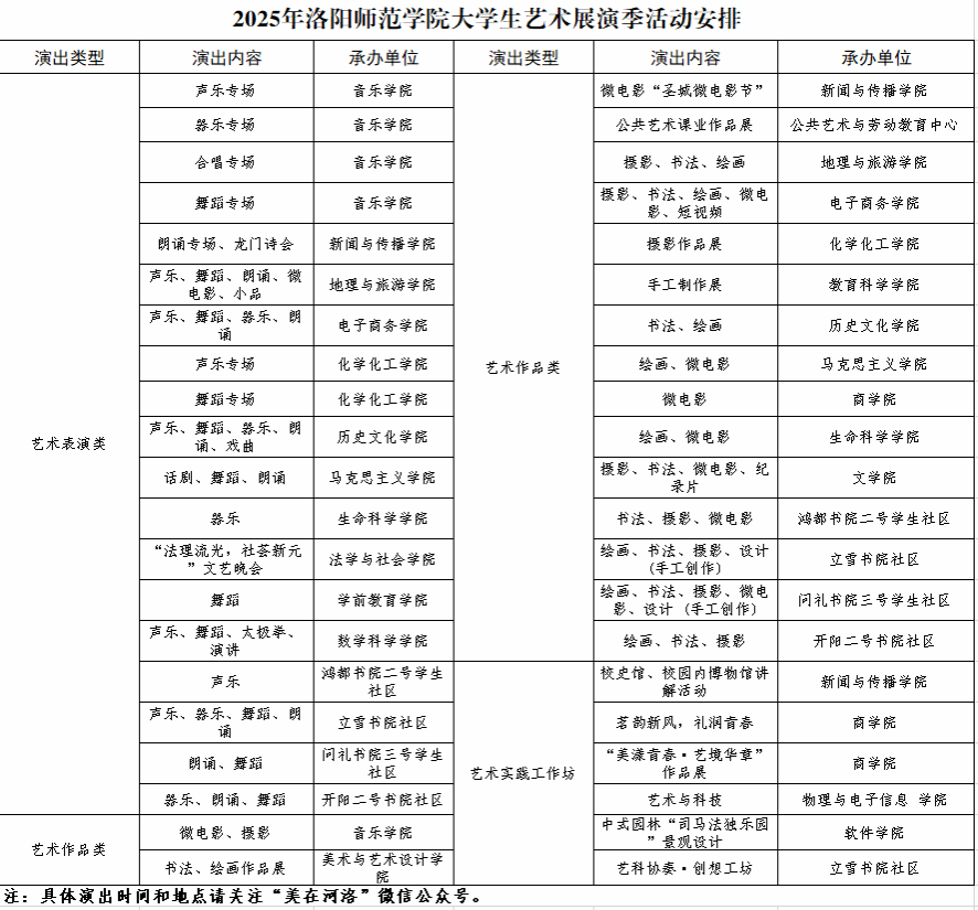 为深入贯彻落实《河南省教育厅关于全面实施学校美育浸润行动的通知》精神,充分展示我校美育成果,营造“向真、向善、向美、向上”的校园文化氛围,经各学院、书院社区积极组织申报后,现学校决定于2025年11月5日正式启动“2025洛阳师范学院大学生艺术展演季”活动。