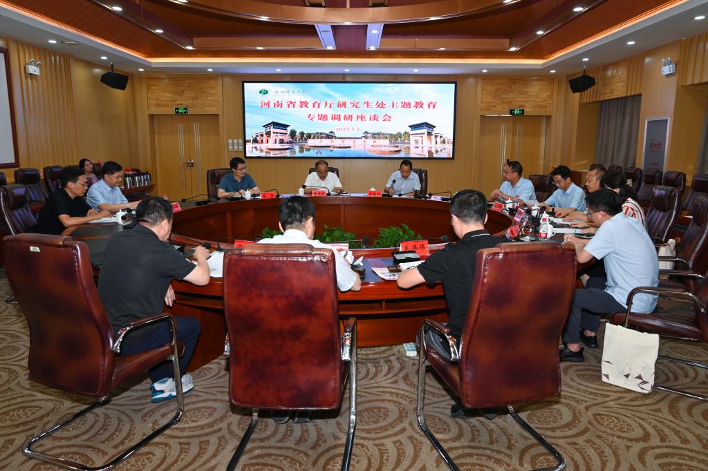 7月5日,省教育厅二级巡视员、研究生处处长曹克舜,省教育厅副总督学岳德胜和省教育厅一级主任科员杨超一行3人莅临我校开展主题教育专题调研。调研座谈会在成均楼B301会议室召开,副校长赵邦屯,洛阳理工学院副校长黄志全,河南科技大学、洛阳理工学院和我校相关部门负责人参加座谈交流。