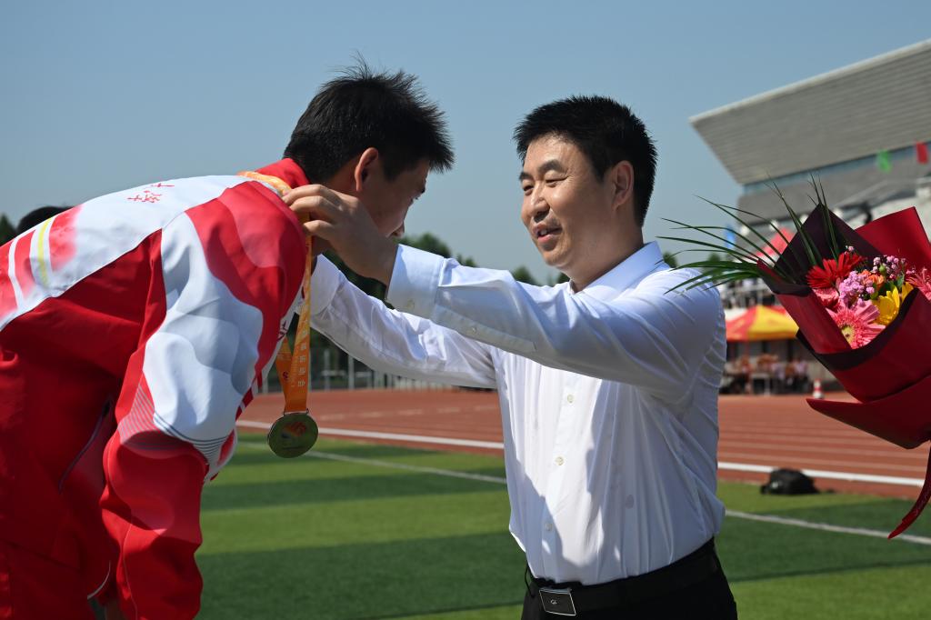 宋争辉、赵学东、毛杰、马宇峰先后为刚刚结束的本科女子乙组铁饼、本科女子甲组100米、男子乙组5000米、本科男子丙组5000米的获奖选手颁发了奖牌。