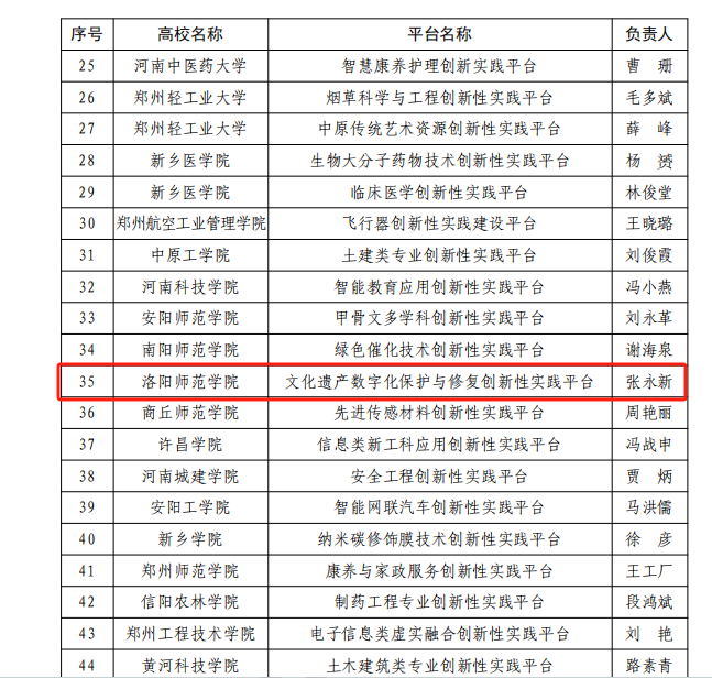 近日,河南省教育厅发布了《关于公布2023年度河南省本科高校研究性教学系列项目名单的通知》,我校信息技术学院张永新申报的“文化遗产数字化保护与修复创新性实践平台”项目获批立项。