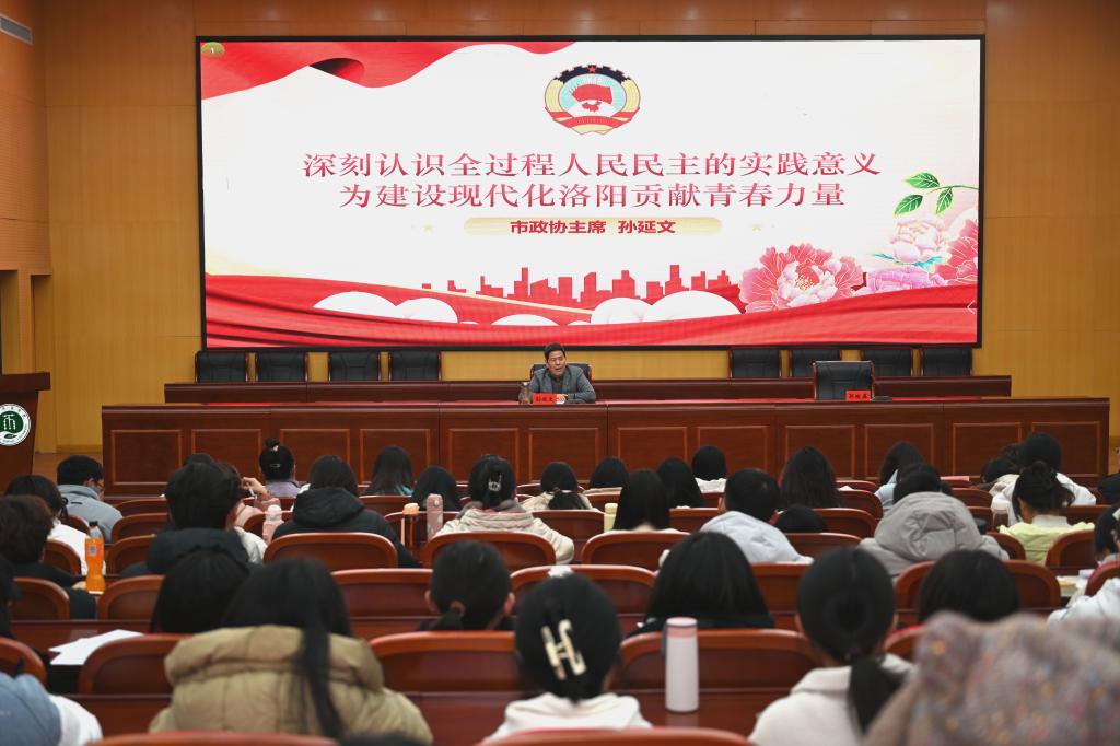 12月26日下午,洛阳市政协党组书记、主席孙延文莅临我校,以《深刻认识全过程人民民主的实践意义 为建设现代化洛阳贡献青春力量》为题,为我校学生讲授思政课,校党委书记郭改英主持报告会,我校师生代表二百余人聆听报告。