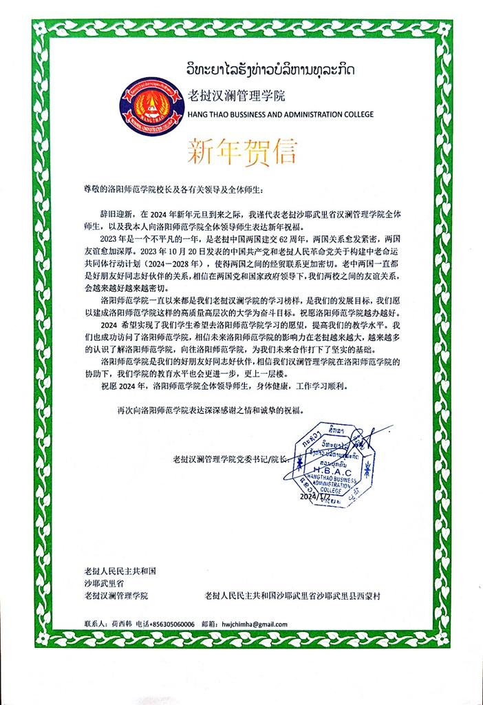 在2024年元旦之际,老挝汉澜管理学院党委书记、院长西潘·占塔佩代表老挝汉澜管理学院全体师生向我校发来新年贺信,对全体师生致以新年祝福。西潘·占塔佩在信中提到:2023年是不平凡的一年,是两国建交62周年,两国关系愈发紧密,友谊愈加深厚。2023年10月20日发表的《关于构建中老命运共同体行动计划(2024-2028年)》,使得两国之间的经贸联系更加密切。我们成功访问了洛阳师范学院,洛阳师范学院的影响力在老挝越来越大。2024年希望实现我们学生去洛阳师范学院学习的愿望,为我们未来的合作打下基础。洛阳师范学院是我们的好朋友好同志好伙伴,相信汉澜管理学院在洛阳师范学院的协助下,教育水平会更上一层楼。西潘·占塔佩祝愿,2024年洛阳师范学院全体领导师生,身体健康,工作学习顺利。