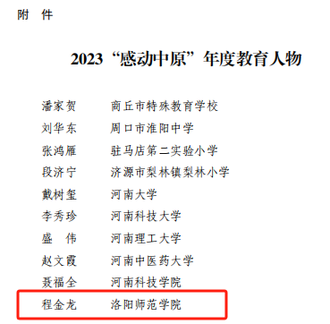近日,河南省教育厅2023年“感动中原”年度教育人物评选结果出炉,我校地理与旅游学院程金龙教授成功入选。全省共有10位优秀教师获此殊荣。