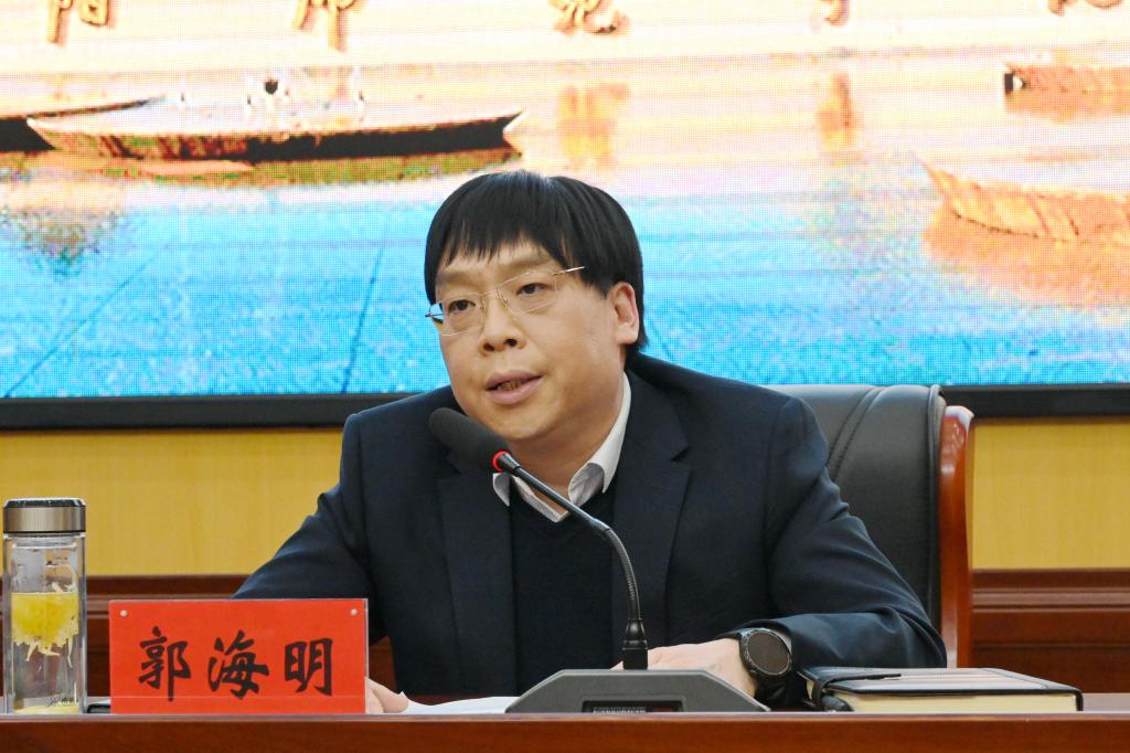郭海明就贯彻落实好会议精神提出三点要求:一是迅速传达学习。切实把思想和行动统一到学校党委的决策部署上来,引导广大师生员工做到思想一致、目标一致、行动一致。二是狠抓工作落实。以学校的工作要点为指导,认真研究谋划本单位的工作,明确目标、细化任务、责任到人、措施到位。三是突出领导带头。各级领导干部要充分发挥模范带头作用,带头转变作风、攻坚克难,知责于心、履责于行,为顺利完成全年目标任务、加快建设特色鲜明的地方高水平师范大学而团结奋斗。