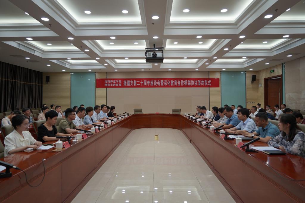 郭改英指出,此次教育援疆20周年座谈会暨合作签约仪式,既是对过去20年教育援疆工作的回顾总结,更是对进一步深化拓展教育援疆工作的谋划和展望。学校将以此为新的起点,牢记“国之大者”,与哈密市委市政府深化教育战略合作,围绕实习支教、师资培训、文化交流、人才培养、科技创新等方面,进一步总结工作经验、固化合作成果,健全工作机制、创新思路举措,强化协同联动、凝聚工作合力,整合优势资源、推动共建共享,共同打造洛哈教育高地,更好地服务哈密市基础教育和社会经济发展,推动我校教育援疆工作再上新台阶、取得新成效。