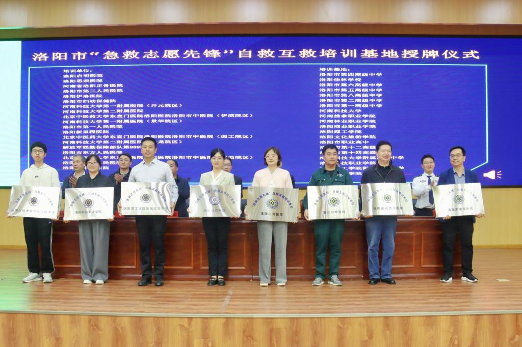 乔思军、张晓先后致辞;培训基地代表和培训单位代表分别作了交流发言。与会领导分别为急救站和培训基地进行授牌,为医院代表进行授旗。我校被授予洛阳市“急救志愿先锋”自救互救培训基地。