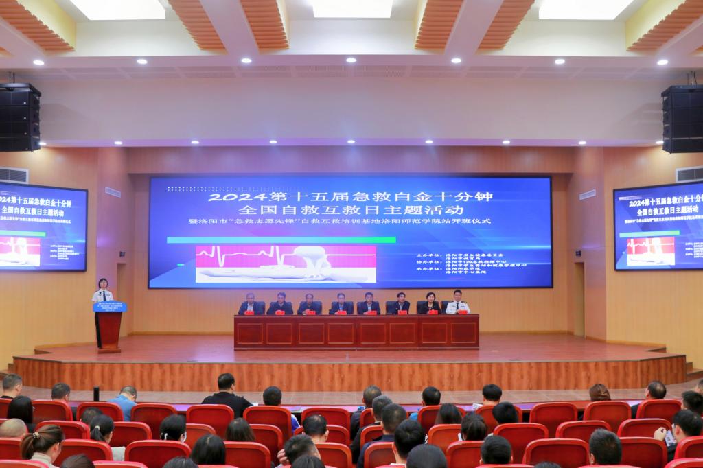 10月10日,2024第十五届“急救白金十分钟·全国自救互救日”主题活动暨“急救志愿先锋”自救互救培训基地洛阳师范学院站开班仪式在我校逸夫楼G1-112报告厅举行。校党委副书记张运礼、洛阳市文明办副主任田利峰、洛阳市教育局副局长乔思军、洛阳市卫生健康委员会副主任张晓、洛阳市120急救指挥中心主任张广武出席,洛阳市中心医院等20家医院代表、河南科技大学等20所院校培训基地代表以及我校近200名学生志愿者参加。