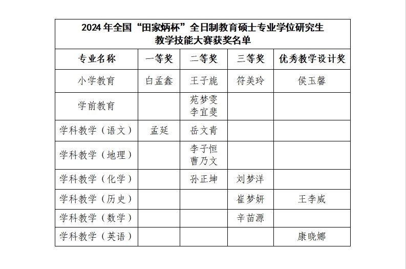 近日,全国“田家炳杯”全日制教育硕士专业学位研究生教学技能大赛决赛落下帷幕。经过激烈角逐,我校研究生凭借扎实的专业知识、过硬的教学技能在比赛中脱颖而出,荣获一等奖2项,二等奖7项,三等奖4项,优秀教学设计奖3项,其中我校是河南省高校小学教育专业唯一获得一等奖的院校。8名教师荣获优秀指导教师。