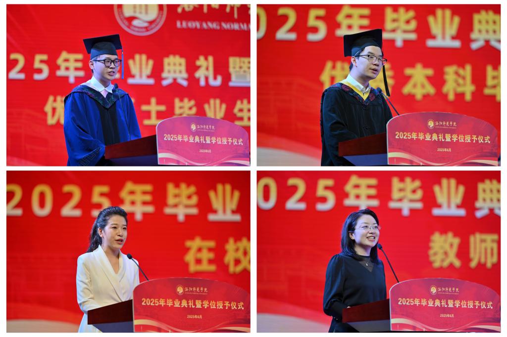优秀硕士毕业生代表赵继钊、优秀本科毕业生代表宋金钊先后发言,表达了毕业学子对母校的感激之情;在校生代表张悦、教师代表物理与电子信息学院博士高雅表达了对2025届毕业生的美好祝愿。