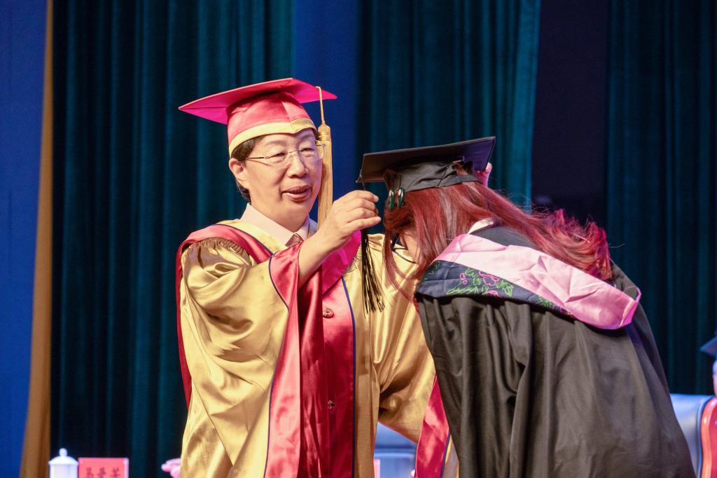 校党委书记郭改英为毕业生代表正冠拨苏并授予学位