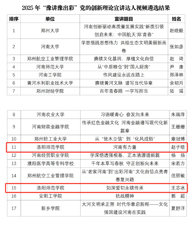 近日,由河南省教育厅遴选的“豫讲豫出彩”党的创新理论宣讲达人专家库名单揭晓,全省高校有45名同志入选,我校马克思主义学院教师王志冰、龙门书院2号学生社区辅导员赵子晗成功入选。