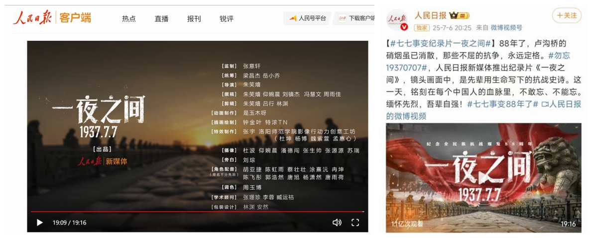 近日,我校新闻与传播学院影像行动力创意工坊受邀参与《人民日报》AIGC动画内容制作的七七事变纪录片《一夜之间》在《人民日报》新媒体全平台首播。截至发稿,该片在微博平台播放量超1.1亿。