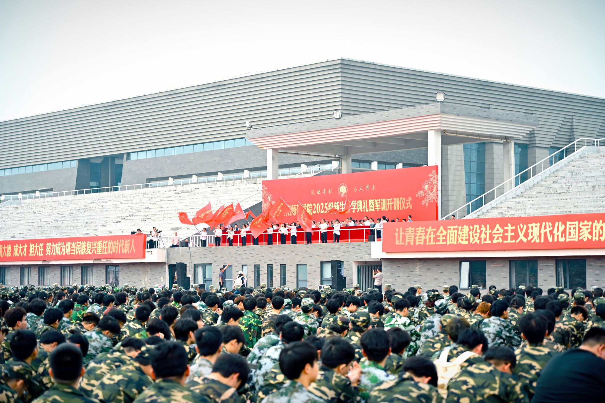 9月15日上午,我校2025级新生开学典礼暨军训开训仪式在北田径场举行。校党委书记郭改英,党委副书记、校长赵海彦,党委副书记张运礼、曹玉涛,纪委书记、监察专员练忠杰,副校长赵邦屯、冯恒强、马录芳、程金龙、史明艳,军训团团长66069部队吕博上校出席,学校有关部门、各学院、书院负责同志,军训教官、教师代表、新生辅导员、高年级学生代表和2025级全体新生共同参加典礼。开学典礼暨军训开训仪式由张运礼主持。