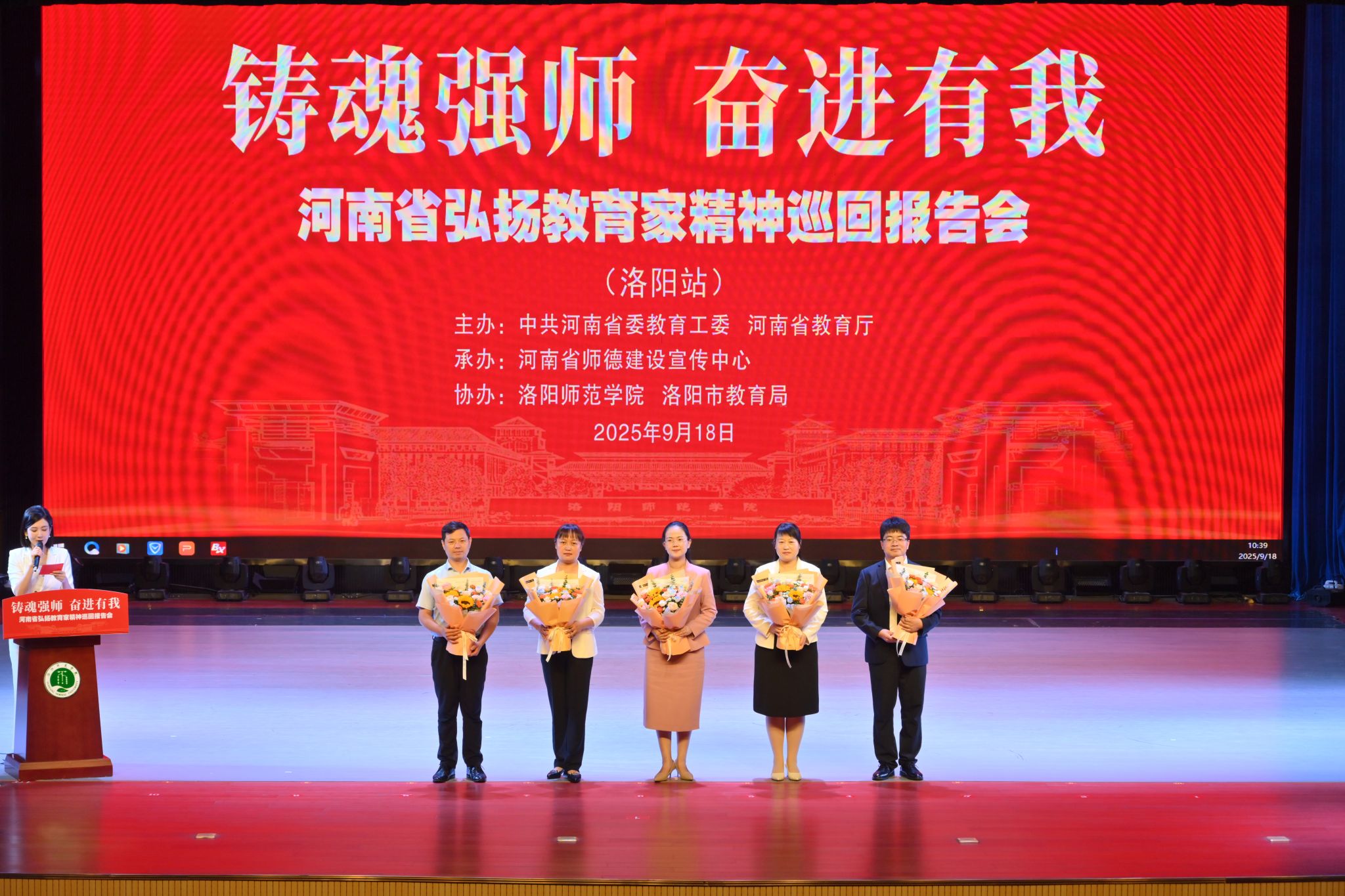 为深入学习贯彻党的二十大精神和习近平总书记关于教育的重要论述,以教育家精神铸魂强师,全面加强新时代教师队伍建设,弘扬高尚师德师风,9月18日上午,由中共河南省委教育工委、河南省教育厅主办,河南省师德建设宣传中心承办的“铸魂强师,奋进有我”河南省弘扬教育家精神巡回报告会在我校举行。河南省教育厅教师工作处副处长肖向毅、洛阳市教育局副局长梁晓丽出席,校党委副书记曹玉涛出席并致辞。洛阳市中小学教师代表和我校师生代表共400余人聆听报告会。