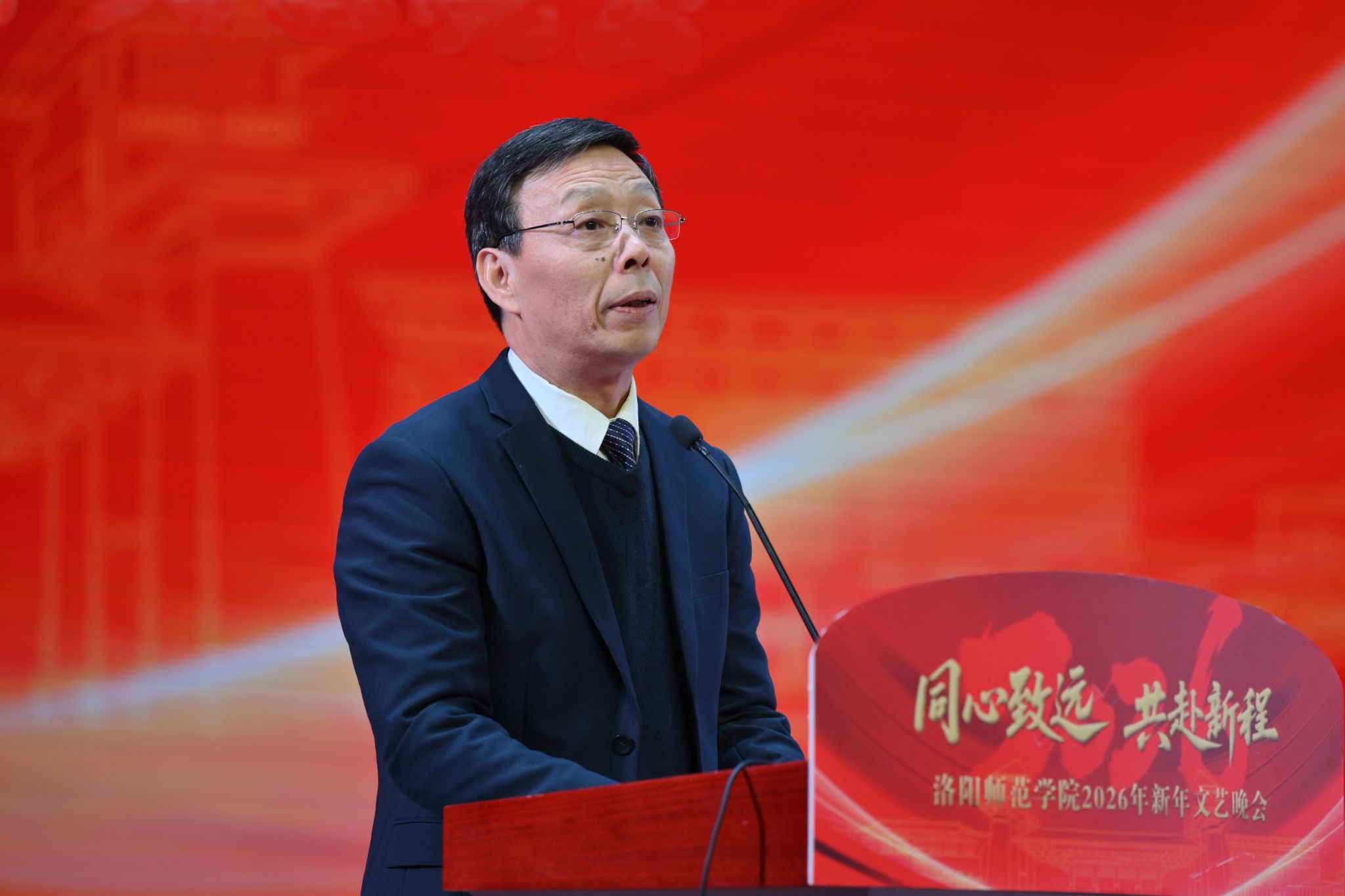 赵海彦致新年贺词,向大家致以节日的问候和美好的祝福。他全面回顾总结了2025年学校在学科建设、科学研究、思政育人、文明创建、民生保障等方面取得的成绩。他强调,2026年既是“十五五”规划开局之年,也是学校建校110周年。全体洛师人要赓续百年文脉、恪守育人初心,以奋斗致敬先贤,用实干传承薪火,不断开创学校事业高质量发展新局面,为奋力谱写中原大地推进中国式现代化新篇章作出新的更大贡献!