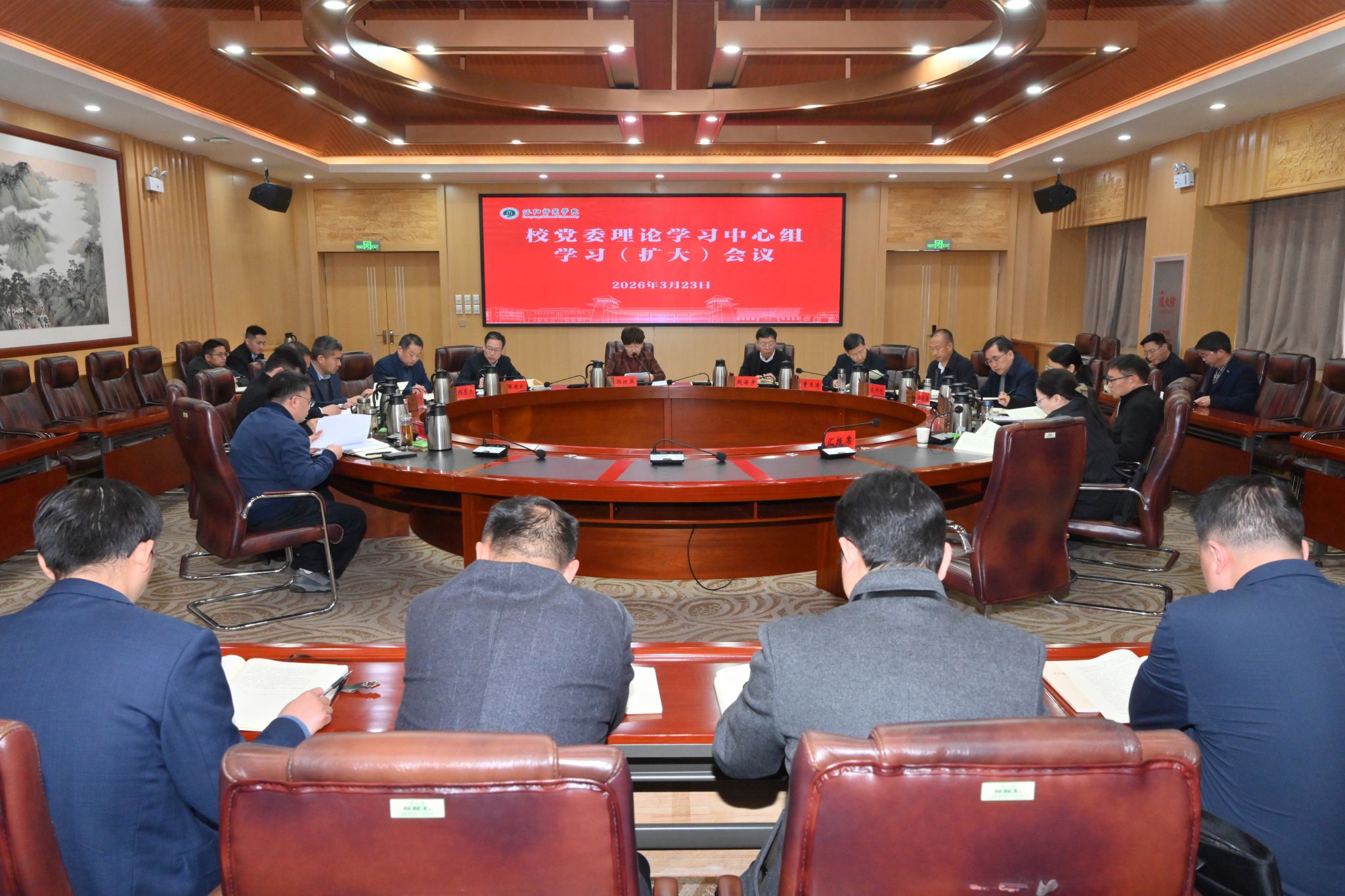 3月23日,校党委理论学习中心组在成均楼B301会议室举行集体学习扩大会议,传达学习2026年全国两会精神,研究部署贯彻落实工作。校党委理论学习中心组全体成员参会,有关职能部门负责人列席会议。校党委书记郭改英主持学习会。