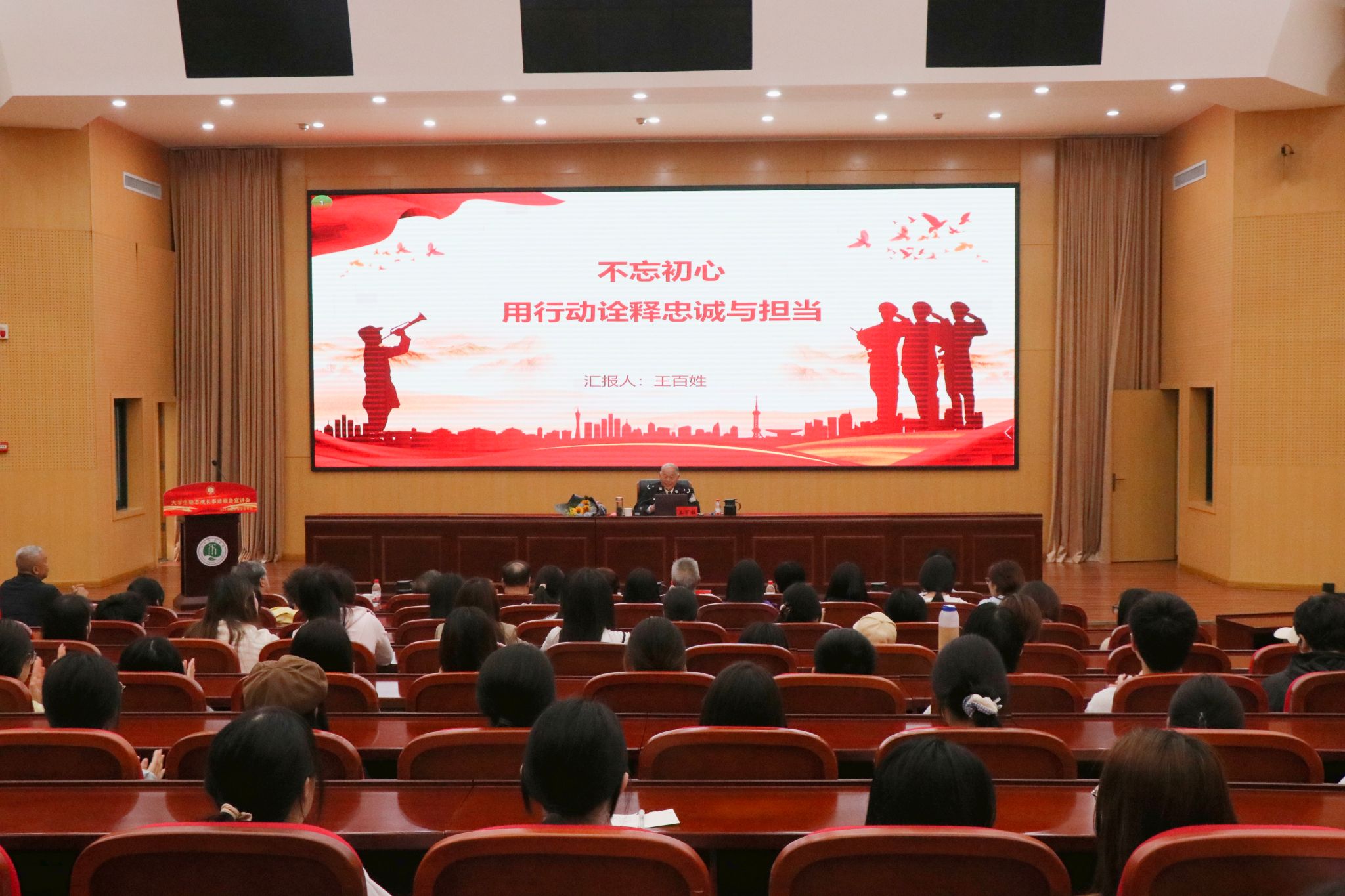 王百姓结合自身排爆工作经历作专题分享,用朴实的话语讲述了排爆一线的惊险瞬间、面对危险的坚定抉择,以及坚守岗位的担当,其无畏勇气与赤子情怀打动了在场每一位师生。他还寄语青年学子,青春的价值在于担当,使命在于坚守,希望新时代青年坚定理想信念,锤炼过硬本领,将个人理想融入强国建设、民族复兴伟业,用实际行动书写青春华章。