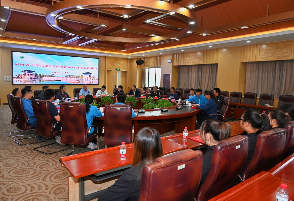 5月17日上午,我校在成均楼B301会议室举行河南省大学生第21届田径运动会表彰座谈会,对在运动会中取得优异成绩的个人和团体进行表彰。校长梁留科,副校长赵海彦,校工会、教务处、公共体育教研部、体育学院有关负责人,参赛教练员及运动员代表参加座谈会。