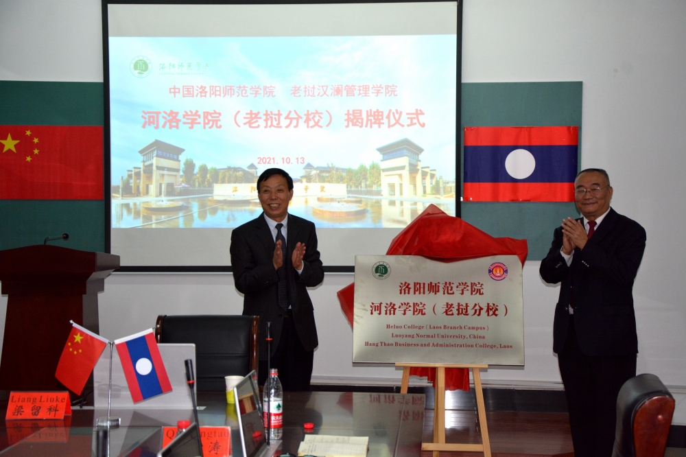 梁留科、西潘•占塔佩在中老两地同时为“洛阳师范学院河洛学院(老挝分校)”揭牌;西潘•占塔佩为“洛阳师范学院河洛文化国际人文交流中心”揭牌。