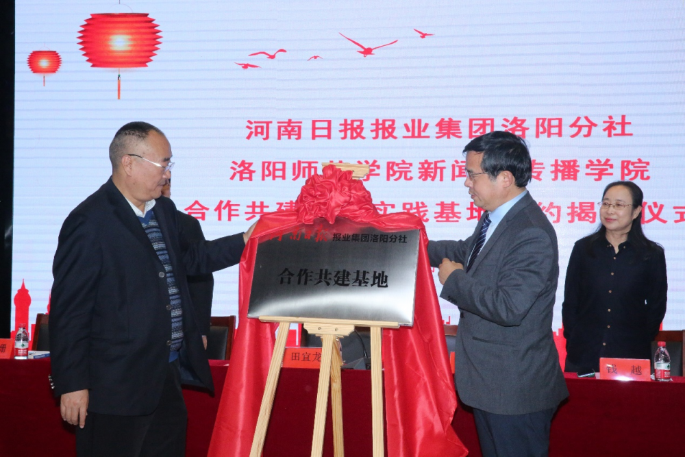 校长梁留科与河南日报报业集团洛阳分社社长田宜龙共同为融媒体实践基地揭牌