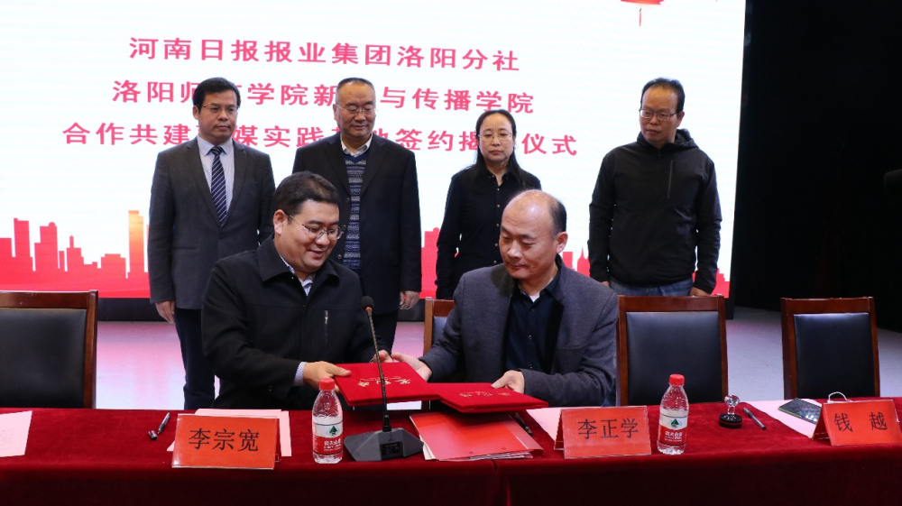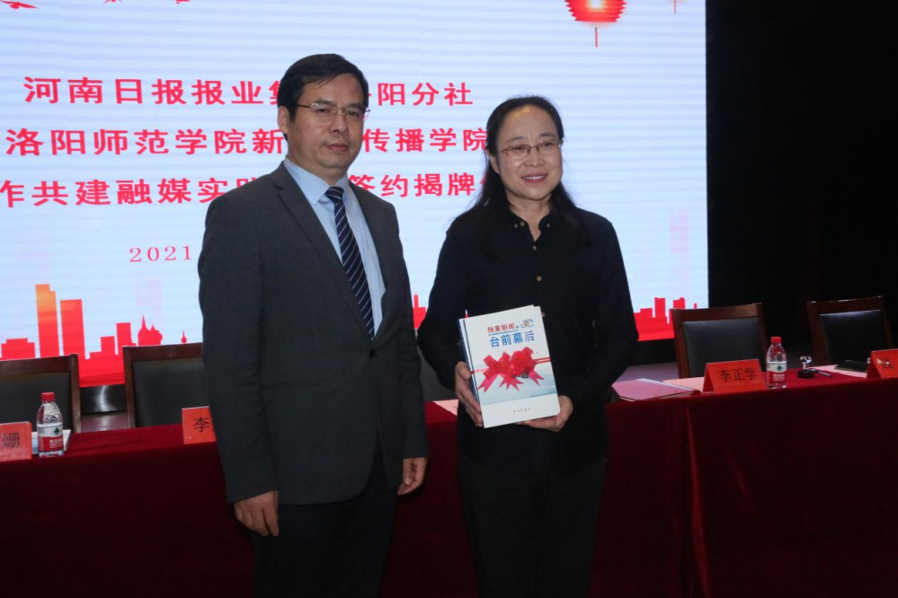 新闻与传播学院院长李正学与李宗宽代表双方签署合作协议;洛阳分社向新闻与传播学院捐赠书籍《独家新闻的台前幕后》。