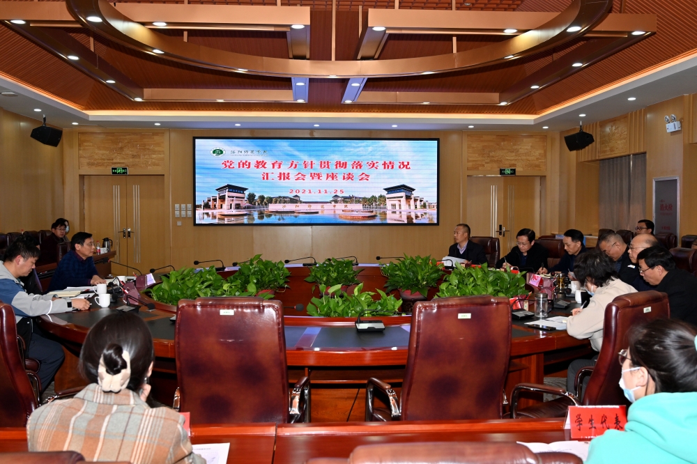 11月25日,以省委高校工委原专职委员高治军为组长的省委党的教育方针贯彻落实情况专项督查组一行3人莅临我校督查。汇报座谈会在成均楼B301会议室举行。全体在校校领导,党政办公室、党委组织部、党委宣传部、党委学工部、招生就业处等部门主要负责人及师生代表参加会议。会议由校党委副书记、工会主席郭新民主持。