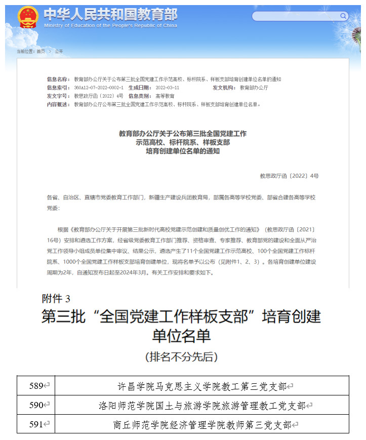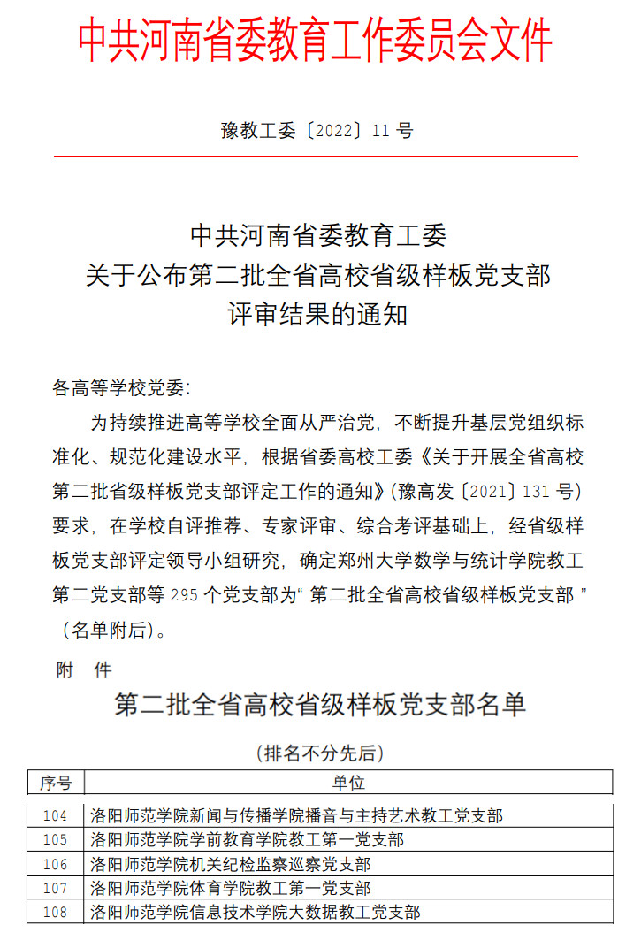 近日,教育部办公厅和中共河南省委教育工委分别印发《关于公布第三批全国党建工作示范高校、标杆院系、样板支部培育创建单位名单的通知》《关于公布第二批全省高校省级样板党支部评审结果的通知》,公布了11个全国党建工作示范高校、100个全国党建工作标杆院系、1000个全国党建工作样板支部培育创建单位和295个第二批全省高校省级样板党支部名单,我校多个党支部榜上有名。