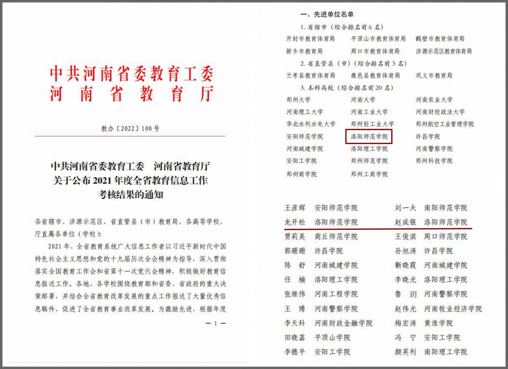 近日,中共河南省委教育工委、河南省教育厅下发《关于公布2021年度全省教育信息工作考核结果的通知》(教办〔2022〕100号),我校被评为2021年度全省教育信息工作先进单位,连续两年获此荣誉;党委宣传部龙开松、党政办公室赵成银两位同志被评为全省教育信息工作先进个人。