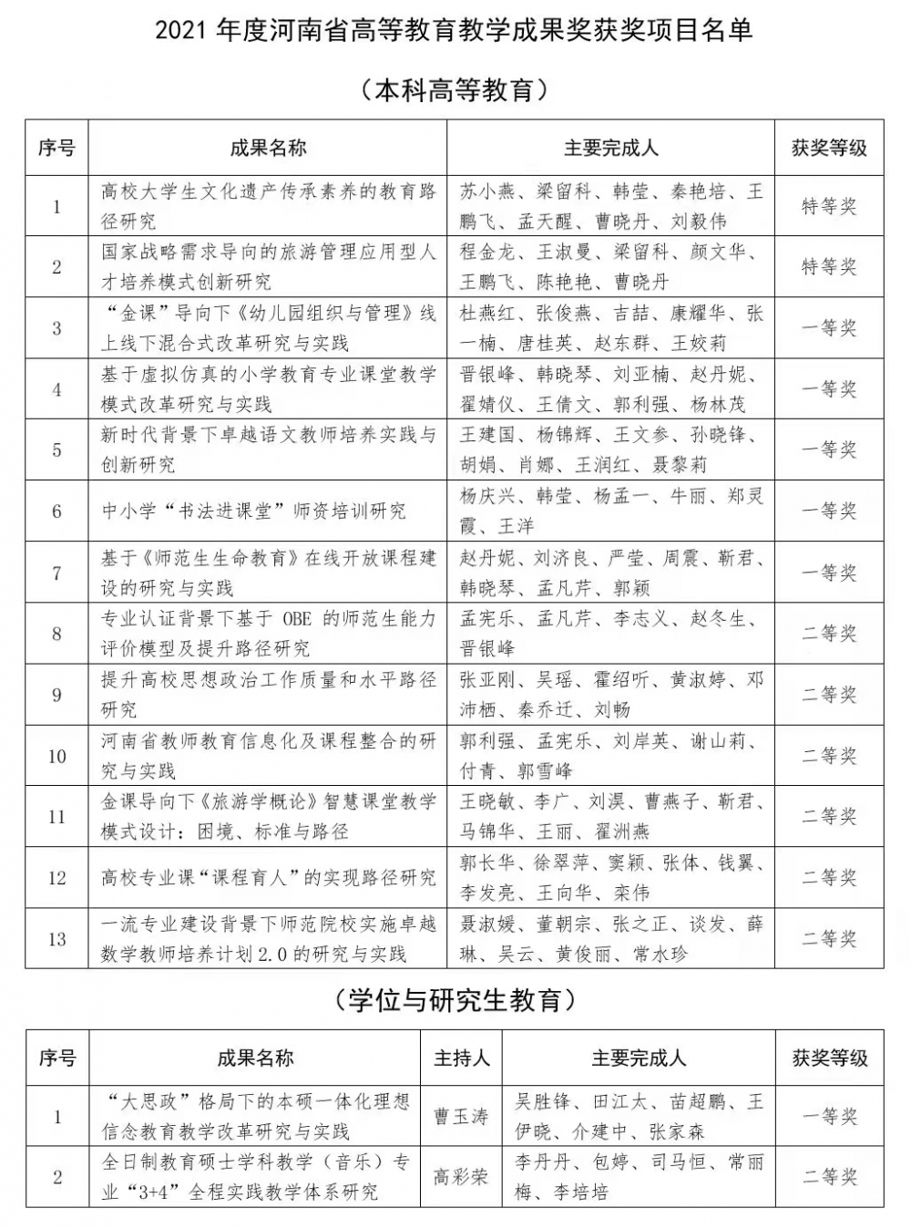 近日,省教育厅下发《关于公布2021年度河南省高等教育教学成果奖获奖项目的通知》(教高〔2022〕111号),我校获得河南省高等教育教学成果奖15项。其中,学位与研究生教育类获奖2项(一等奖1项、二等奖1项),本科高等教育类获奖13项(特等奖2项、一等奖5项、二等奖6项),获奖等级、数量均位居省内同类高校前列,创学校历史最好成绩。