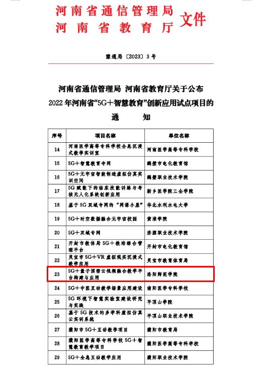 近日,河南省通信管理局、河南省教育厅发文公布了2022年河南省“5G+智慧教育”创新应用试点项目名单,我校申报的“5G+量子国密云视频融合教学平台构建与应用”项目成功获批。