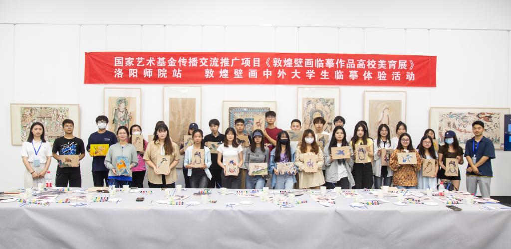 6月20日上午,国家艺术基金2020年度传播交流推广资助项目“大美华彩——敦煌壁画临摹作品高校美育展”在我校开展。开幕仪式在河洛美术馆鸿都广场举行,副校长赵邦屯,西北师范大学博士生导师、项目负责人、敦煌学院首任院长田卫戈教授,洛阳龙门石窟研究院院长、博士生导师史家珍教授,洛阳市文联副主席、洛阳市美术家协会主席、洛阳美术馆馆长张建京,科研管理处、美术与艺术设计学院相关负责人以及师生代表参加活动。