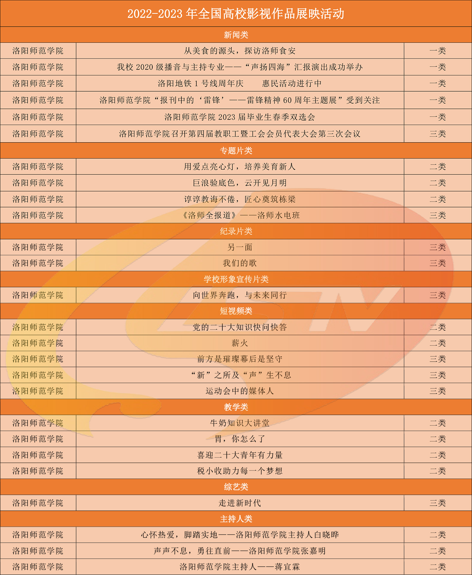 7月11日,2022-2023年全国高校影视作品展映活动结果揭晓,我校广播电视台选送的26部作品斩获5项一等奖、12项二等奖、9项三等奖,再创历史新高,获奖数目和等级在全国高校中位居前列。