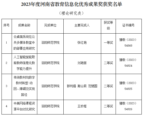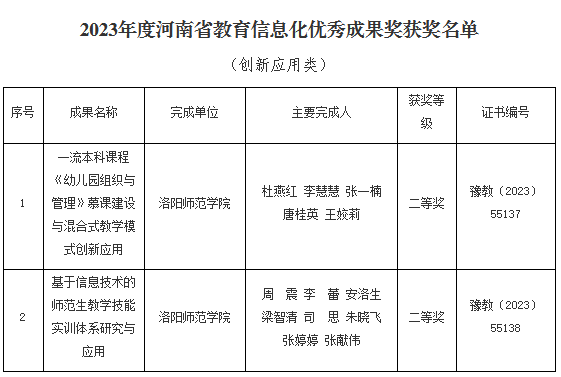 近日,河南省教育厅下发《关于公布2023年度河南省教育信息化优秀成果奖获奖名单的通知》(教科技〔2023〕312号),公布了2023年河南省教育信息化优秀成果获奖名单,我校共有6个项目获奖,其中获得理论研究类一等奖1项,二等奖3项,创新应用类二等奖2项。