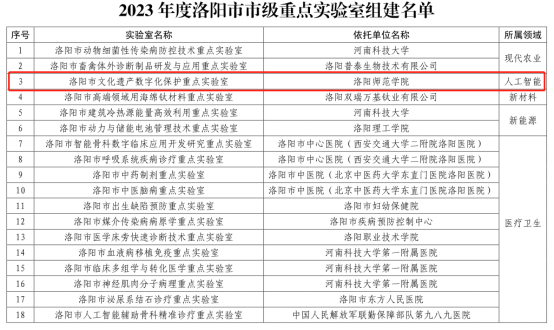 近日,洛阳市科技局公布了2023年度洛阳市新建重点实验室名单(洛市科[2023]70号),我校张永新教授牵头申报的“洛阳市文化遗产数字化保护重点实验室”成功入选。这是我校近年来不断加强基础理论研究与应用技术研发,积极融入国家和省市科技创新体系的结果。