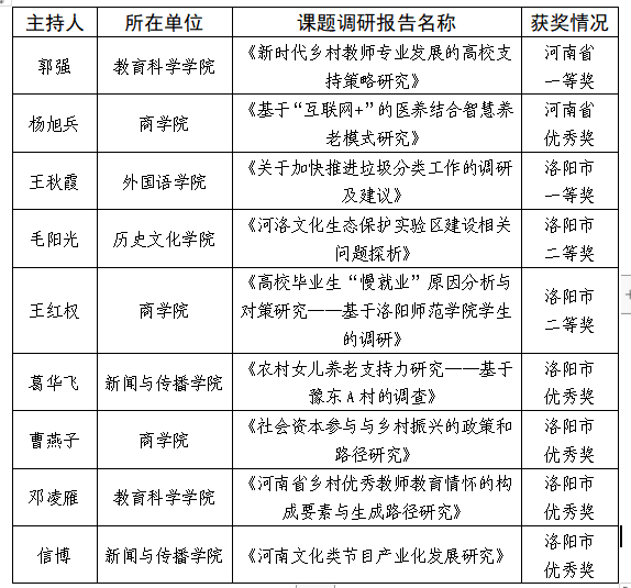 近日,中共河南省委统战部下发《关于河南省党外知识分子联谊会2023年度建言献策优秀成果的通报》、中共洛阳市委统战部下发《关于洛阳市党外知识分子联谊会2023年度建言献策优秀成果的通报》,我校共有9项课题调研报告获省委、市委统战部通报表彰,其中,获河南省优秀成果一等奖1项、优秀奖1项,获洛阳市优秀成果一等奖1项、二等奖2项、优秀奖4项。