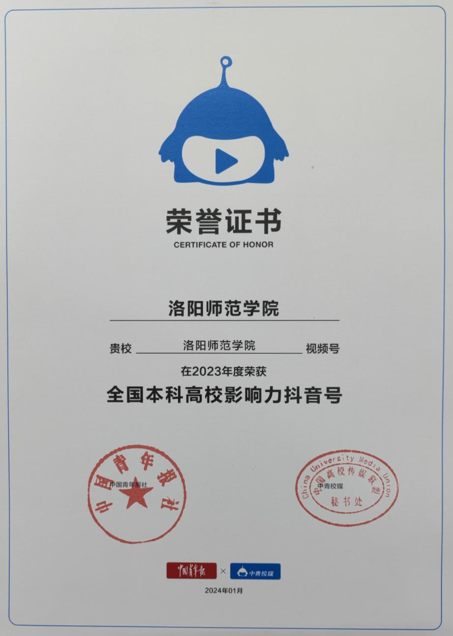学校官方抖音号开通于2018年,由党委宣传部负责运维,平台以“讲好洛师故事、传播洛师声音”为出发点,紧扣学校发展改革成就,聚焦师生关注热点,坚持“传播正能量”,着力打造“有高度、有深度、有温度、有亮度”的网络育人阵地,创作推出了一系列深受师生喜爱的“爆款”短视频作品,被主流媒体多次转载报道。