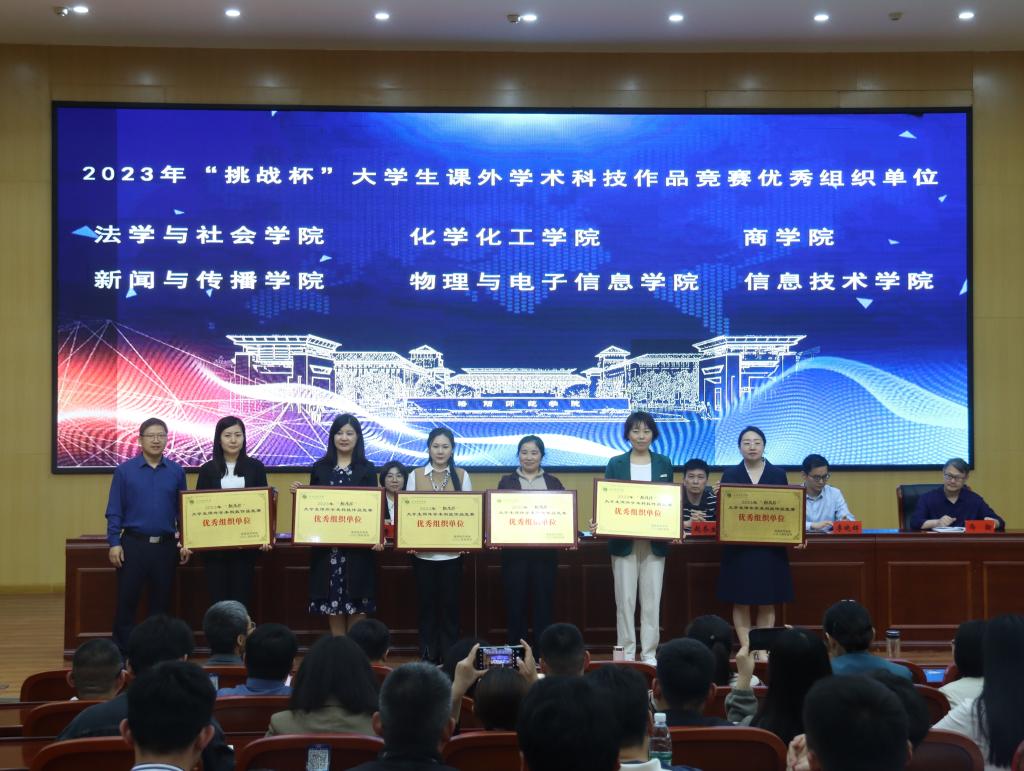 教务处处长赵冬生宣读了《2023年“挑战杯”大学生课外学术科技作品竞赛表彰决定》。副校长曹玉涛为2023年“挑战杯”大学生课外学术科技作品竞赛优秀组织单位、国赛获奖作品、优秀指导教师、先进工作者获奖代表颁奖。优秀指导教师代表王静毅、学生代表叶兴华分享了参加“挑战杯”竞赛的经验、收获和体会。