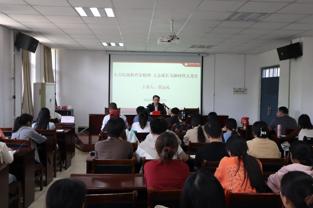 4月23日下午,校党委副书记张运礼在A6-416教室以《大力弘扬教育家精神 立志成长为新时代大先生》为题,为问礼书院二号院师生代表讲授思政课。问礼书院二号院领导班子、育人导师和学前教育、小学教育专业学生代表等60余人同上思政课。