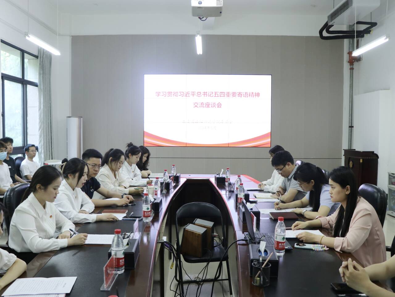 5月15日下午,我校在敦行楼122会议室召开学习贯彻习近平总书记五四重要寄语精神交流座谈会。校团委负责同志,青年教师团干、学生团学骨干以及来自各学院的团员代表参加。