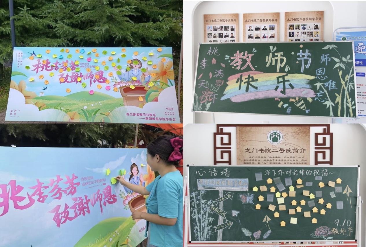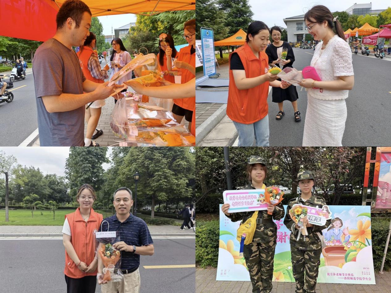 校学生会组织开展了“老师,我想对您说”“笔端生芳华,润物谢恩师”“感念师恩,以花传情”系列活动,同学们写下对老师们的祝福语并赠送鲜花,表达自己的敬意和祝福。鸿都书院一号、龙门书院二号、问礼书院三号等社区团学组织开展了“倾心祝福,共话师恩”“纸短情长,贺卡传情”“桃李花开,感恩有您”等主题活动,以录制视频、手写贺卡、制作明信片、赠送鲜花等活动形式,表达对老师们言传身教和无私奉献的感激之情。教师节当天,饮食服务中心(资产经营有限责任公司)在桃园、李园、桂园、枣园餐厅向教师们赠送鲜花,工作人员面带笑容将一份份亲手包扎的鲜花献给来餐厅就餐的教职工手中,并送上节日的祝福。