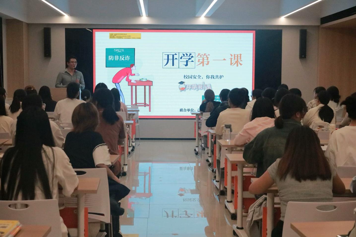 李海峰以大家都熟知的电影《孤注一掷》为切入,引导同学们对当下电信诈骗类型的思考。他以常见且最具陷阱性的“校园贷”诈骗、社会求职诈骗、金融投资诈骗为例详细讲解诈骗全过程,为在座的同学敲响防诈骗的警钟。他表示,建立健全防诈骗安全体系,是平安校园建设的重要一环,校园反诈需要学生、学校、社会多方协力,呼吁同学们要树立文明、理性、科学的消费观,拒绝超前消费,从根本上杜绝“校园贷”;要严密保管个人信息及证件,谨防个人信息泄漏形成被诈骗的风险点。