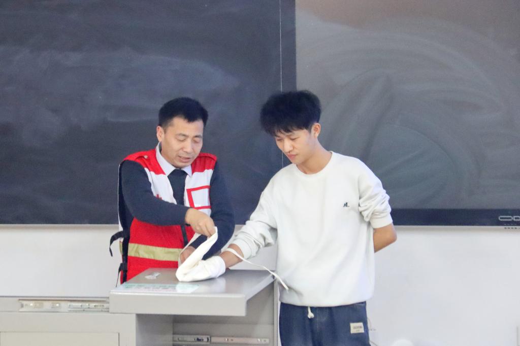 杨振亚详细讲解了心肺复苏术,现场演示了自动体外除颤器(AED)的使用方法和操作步骤,通过互动教学方式讲授了海姆立克急救法、急救创伤包扎、骨折紧急处理等内容,并指导师生进行实操演练。参加培训的80名志愿者通过考核测验以及红十字会认证后将获得初级救护员资格。