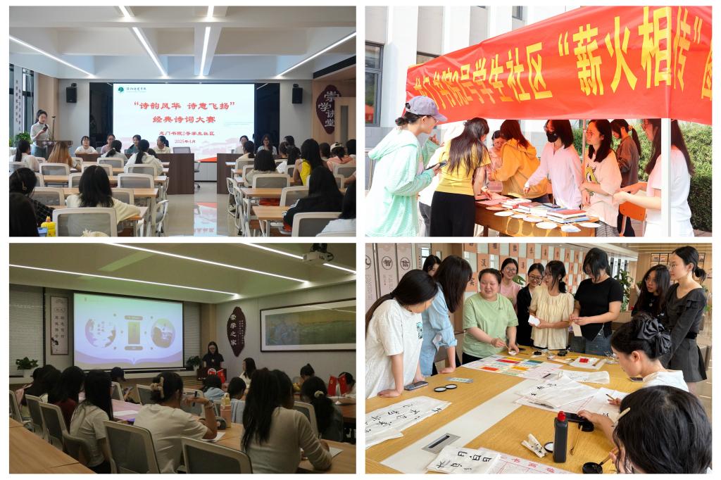现场活动包括“经典诗词朗诵会”、“墨香书韵”三笔字大赛、“诗韵风华,诗意飞扬”经典诗词大赛、“薪火相传”图书漂流等环节。在“古韵新声”经典诗词朗诵会活动中,选手们以声传情,或婉转低徊《清平调》,或慷慨吟诵《将进酒》。大家沉浸经典,在韵律中感受中华优秀传统文化的深厚底蕴,领略诗词穿透时空的永恒魅力。在“墨香书韵”三笔字大赛中,参赛选手通过粉笔、毛笔、钢笔书写经典诗词带领大家感受汉字书法的独特魅力。在“诗韵风华,诗意飞扬”经典诗词大赛中,选手以“风、花、雪、月、思乡、山河、爱国”等为主题进行诗词引用。“薪火相传”图书漂流活动中,同学们带上自己想要交换的图书,在书籍扉页写下班级、姓名以及漂流感言,并在现场“漂流点”选择自己喜欢的书籍进行阅读交换。现场还设置漆扇体验环节,同学们绘制漆扇,感受中华优秀传统文化的魅力。此外,书院还联合文学院新季风文学社开展“悦读青春”读书分享会、举办“读经典,写感悟”征文比赛等活动,进一步提升学生文学素养。