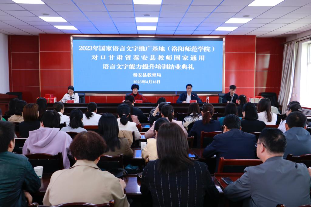 4月18日上午,我校对口甘肃省秦安县教师国家通用语言文字能力提升培训结业典礼在秦安县教育局会议室举行。典礼由秦安县教育局党组成员、副局长高鹏主持,国家语言文字推广基地(洛阳师范学院)教学团队、秦安县教育局相关人员及60余名学员参加了活动。